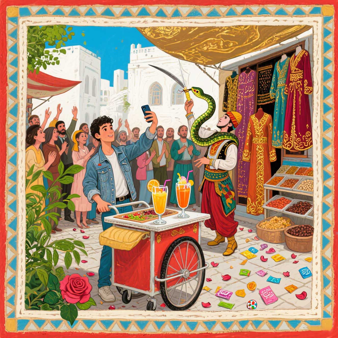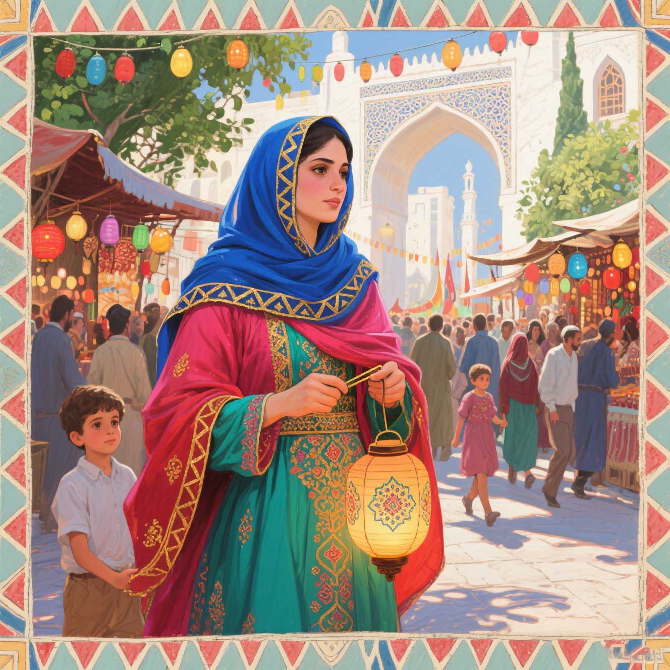 After the prayer, the celebration officially begins. People walk from house to house with gift boxes and smiles, knocking on the doors of relatives and friends. The first greeting is always "Eid Mubarak" (Blessed Eid). Elders tuck "Eid envelopes" (red envelopes with money) wrapped in colored paper into the hands of younger generations. Children, upon receiving the envelopes, skip joyfully to the streets, weaving through crowds with lanterns painted with Persian patterns. The candlelight inside the lanterns flickers, complementing the colored lights hanging in front of every household. In the markets, acrobats' performances draw cheers, while vendors push carts loaded with fruit sherbet, the clink of glass cups ringing out clearly. In parks, families spread carpets and sit together, sharing the Halim and flatbreads they brought. Elders tell stories about Ramadan to children, while young people use their phones to capture these lively moments. The entire country of Iran seems to be wrapped in a "web of joy"—the aroma of food, people's laughter, and children's playful shouts interweaving into a joyous anthem of reunion.