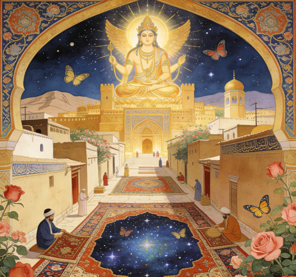 When Kaveh returned to the city with the carpet, wherever the spring water flowed, withered roses sprouted anew, their petals regaining vivid hues, more fragrant than ever. People’s goodness was awakened—neighbors reconciled, and workshops reignited their fires. Kaveh laid the Carpet of Destiny in the city’s central square, where its stars and roses remained forever vibrant, becoming a symbol of Shiraz.