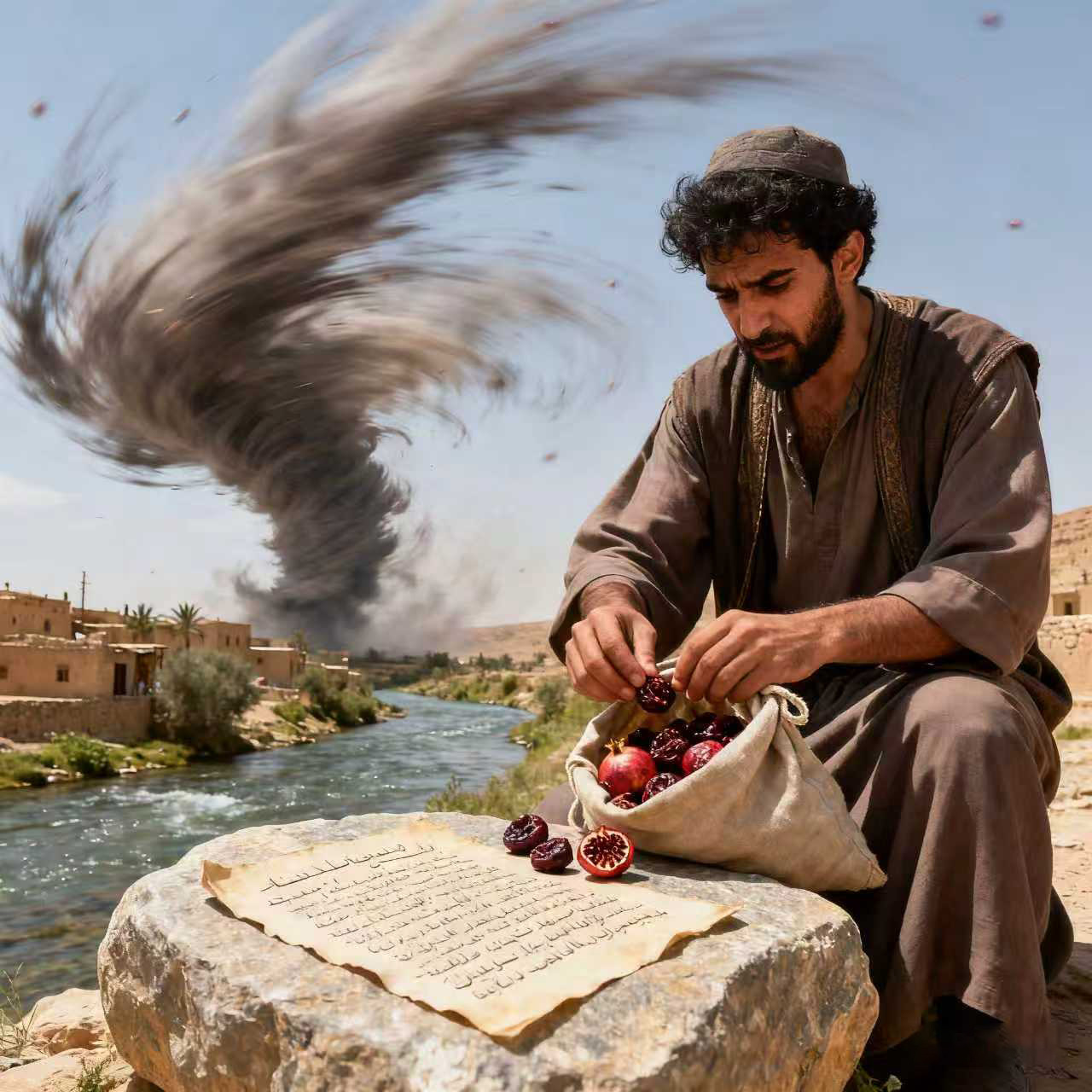 Facing the whirlwind, Farzad scattered the dried pomegranates before the Covenant Stone. His voice was hoarse but unwavering: "This is not a cold stone—it's a covenant to guard the land! These dried pomegranates hold the sincerity of Farha Village's people—the smiles of elders sharing fruit with children, the hope our ancestors guarded for generations! Mithra, if you can see this sincerity, please help us!"