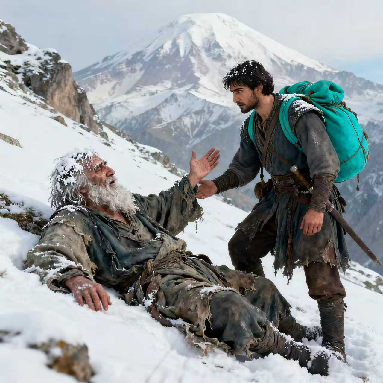 Ardashir set off alone, the turquoise on his back. The Alborz Mountains were lined with icy peaks; along the way, he braved blizzards and avalanches, narrowly escaping death in abysses more than once. When he reached the middle of the mountain, he encountered a ragged old man, barely breathing and begging for a sip of water. Ardashir had only half a waterskin left, but he handed it over without hesitation.