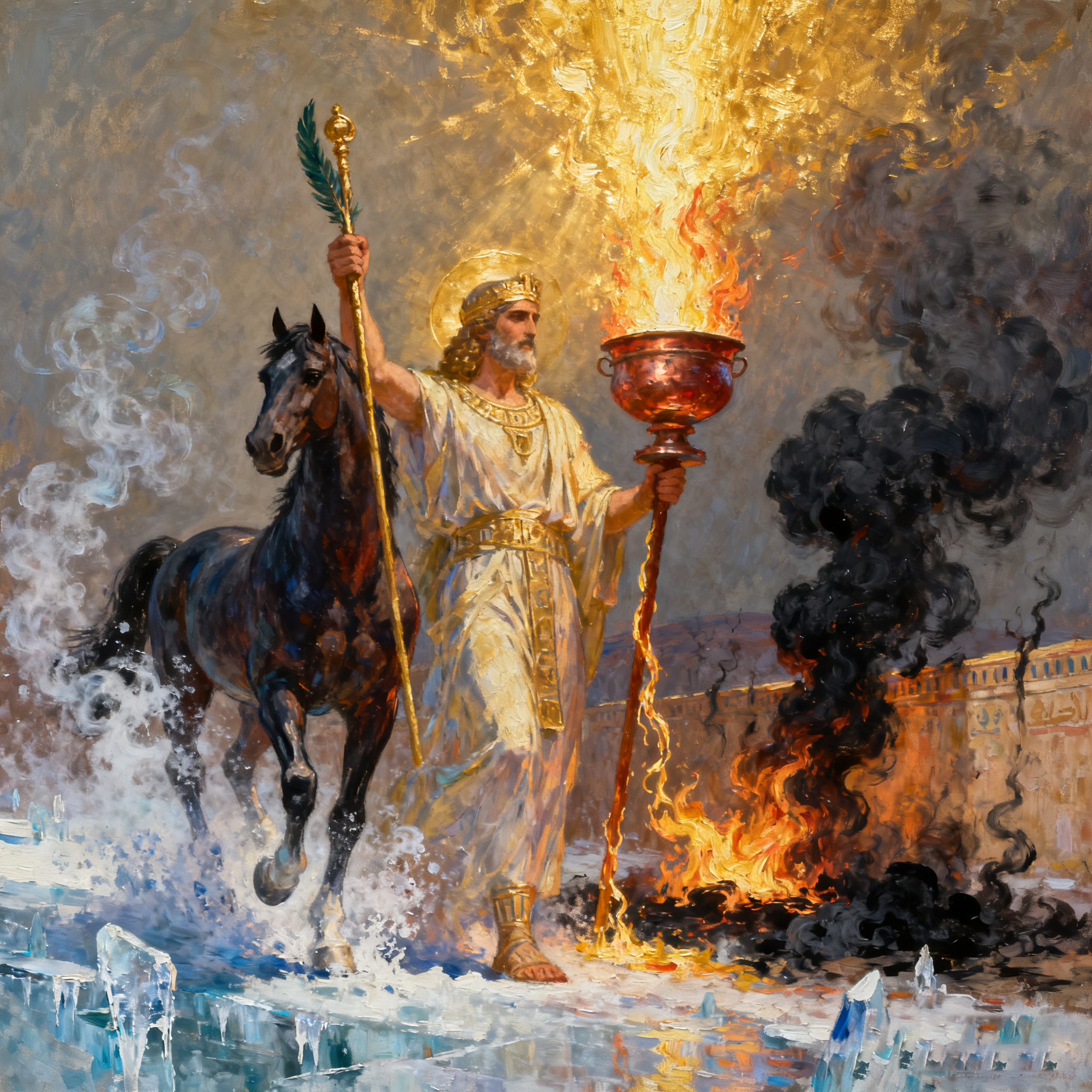 Thanking Perry, Karl turned back for home. No sooner had he left the valley than he encountered Apaosha, transformed into a black horse, snorting ice mist that froze the ground beneath its hooves. Grasping his sacred staff tightly, Karl sprinkled the morning dew onto the ice mist. The dew instantly turned into steaming vapor, clearing a path. As Apaosha roared and charged, Karl suddenly remembered Perry’s words. He held up the bronze cauldron, placed the feather of wisdom on the embers, and shouted aloud: "Ahura Mazda’s goodness endures forever!"