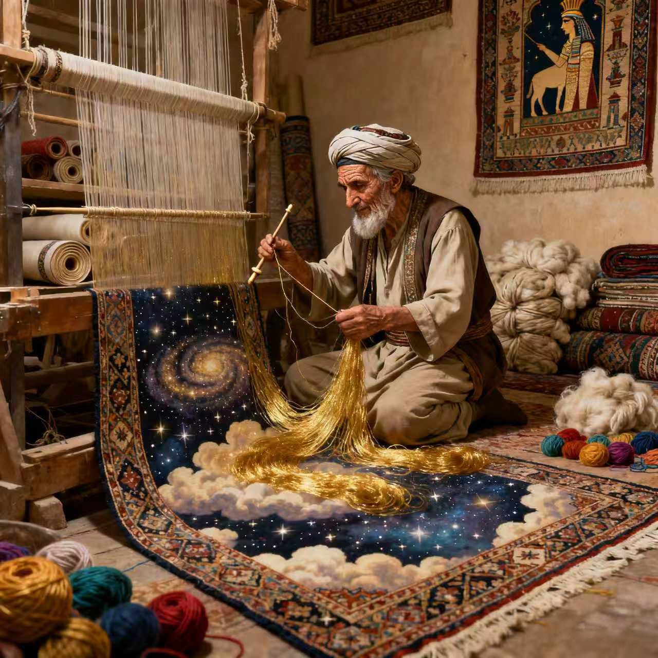 During the Sasanian Empire, the carpets of Shiraz were renowned far and wide, and none surpassed the craftsmanship of the elderly weaver Hadi. His carpets bore intricate patterns like starry skies, and stepping on them felt like treading on clouds—most remarkably, each piece wove into its threads a true story, as if time itself had been spun into wool.